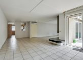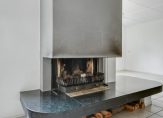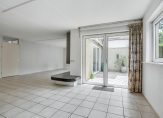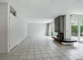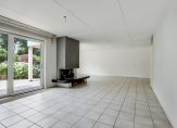 De woonkamer voelt licht en ruim aan, met een gezellige haard en een schuifpui naar de tuin. Dankzij de slimme indeling valt het licht vanuit verschillende hoeken naar binnen, wat zorgt voor een prettige sfeer.