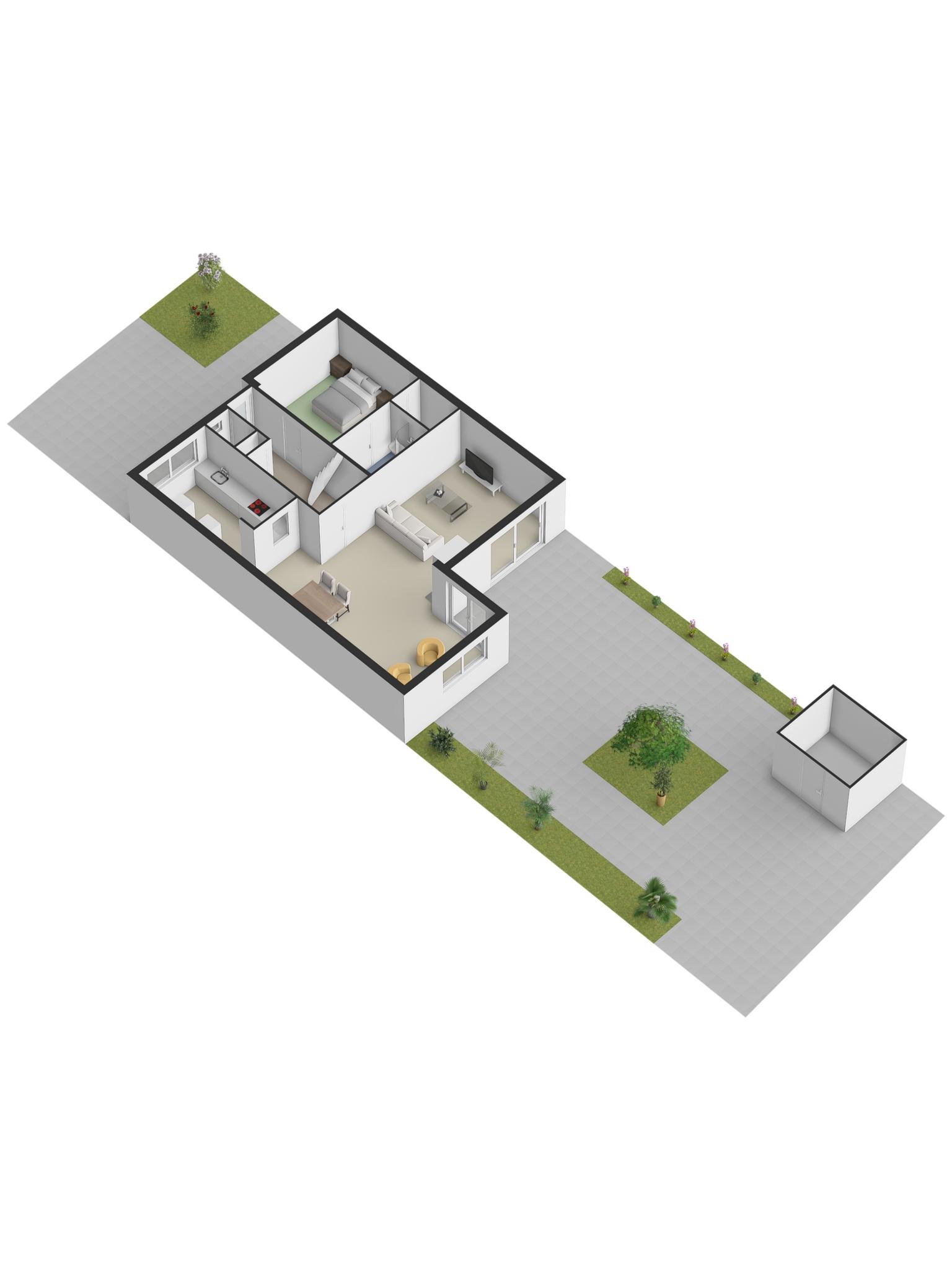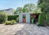 De tuin is echt een plaatje, met weelderige bomen op de achtergrond die zorgen voor een groene, rustige sfeer. De tuin is diep met een perceel van ca. 148 m². Achterin staat een vrijstaande houten schuur met een overkapping, ideaal voor tuinspullen.