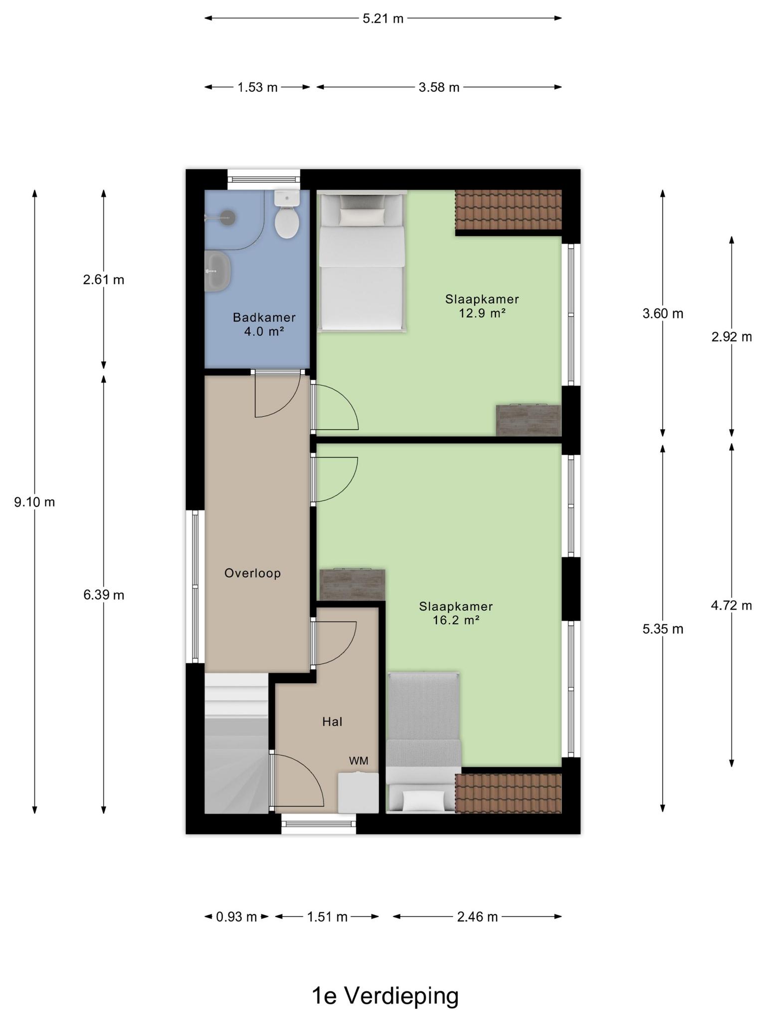 Via de overloop kom je bij twee ruime slaapkamers en een tweede badkamer, voorzien van een douche, wastafel en toilet. Via de overloop bereik je een kleine hal hier zit de aansluiting voor je wasmachine en droger.