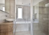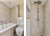 De luxe badkamer is voorzien van een ligbad, inloopdouche, wastafelmeubel en tweede toilet met bidetfunctie. De verwarmde spiegel heeft ingebouwd licht en de gehele ruimte is mooi afgewerkt middels een verlaagd plafond en inbouwspotjes. De inloopdouche is voorzien van een betegelde nis voor douchespullen en wordt afgeschermd door een glazen deur.