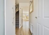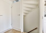 De hal geeft toegang tot de lichte woonkamer, trapopgang, vernieuwde meterkast en een modern toilet met bidetfunctie. Het toilet is verder voorzien van fraai tegelwerk, een wastafel en een ingebouwde toiletrolhouder. De hal is afgewerkt met een houten laminaatvloer die doorloopt in de woonkamer.