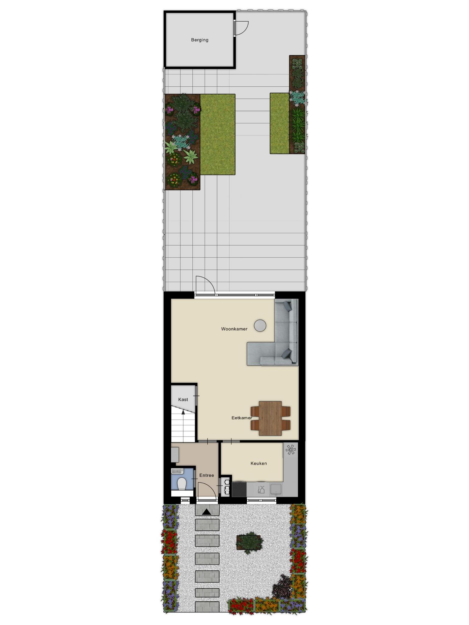 De woning beschikt over een riante, zonnige achtertuin op het oosten met berging. Deze tuin is de ideale plek om te ontspannen en van de zonuren te genieten. Er zijn meerdere plekken om een terras te creëren. De tuin is bestraat, waardoor deze onderhoudsarm is. Het terras is perfect voor het plaatsen van een loungeset en buitentafel. Achterin de tuin bevindt zich een berging, geschikt om tuinspullen en fietsen te stallen. Via de poort kan je de tuin eenvoudig verlaten.