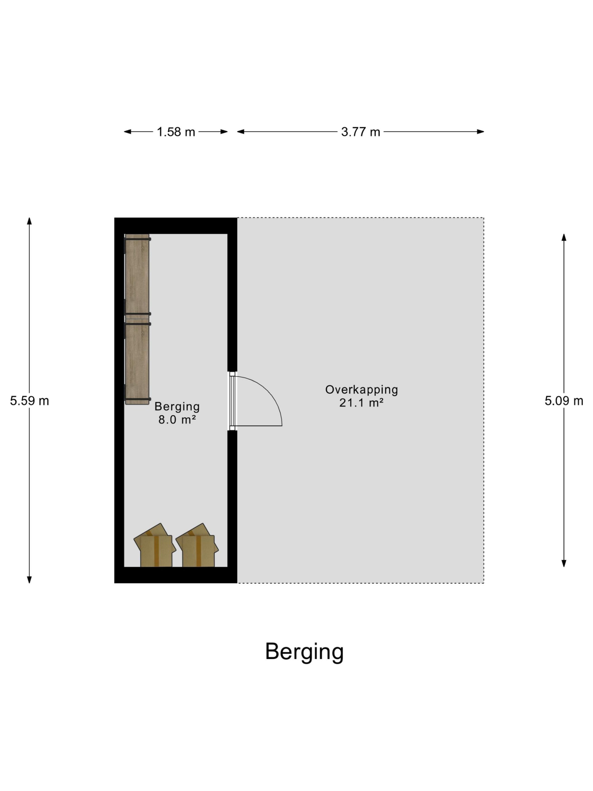 Aan de voorzijde van de woning vind je een berging (ca. 8 m²) en een ruime overkapping (ca. 21 m²), perfect om de auto droog te parkeren. Daarnaast is er ook nog voldoende ruimte om je fiets of scooter neer te zetten.