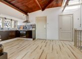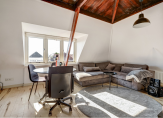 Boven aangekomen valt het prachtige daglicht van de dakkoepel direct op en geeft meteen sfeer aan de woonkamer. Dankzij het hoge plafond en houten balken voelt de ruimte ruim en open, en met ramen aan drie kanten is het appartement heerlijk licht. Voor extra opbergruimte is er een royale vaste kast.