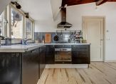 De open keuken in L-opstelling is volledig ingericht met koelkast, vaatwasser, heteluchtcombi-oven, gaskookplaat en afzuigkap. Door de indeling is er voldoende ruimte voor een grote eettafel, zodat je tijdens het koken contact houdt met je gasten.