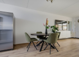 Zodra je binnenkomt, valt de royale en lichte woonkamer op. Er is genoeg plek voor een gezellige zithoek en een grote eettafel. Aan de voorkant van het huis zit de open keuken. Deze is netjes afgewerkt en voorzien van alles wat je nodig hebt: een kookplaat, afzuigkap, combimagnetron, oven, grote koelkast (Siemens), vriezer en een vaatwasser. Alles binnen handbereik om met plezier te koken.