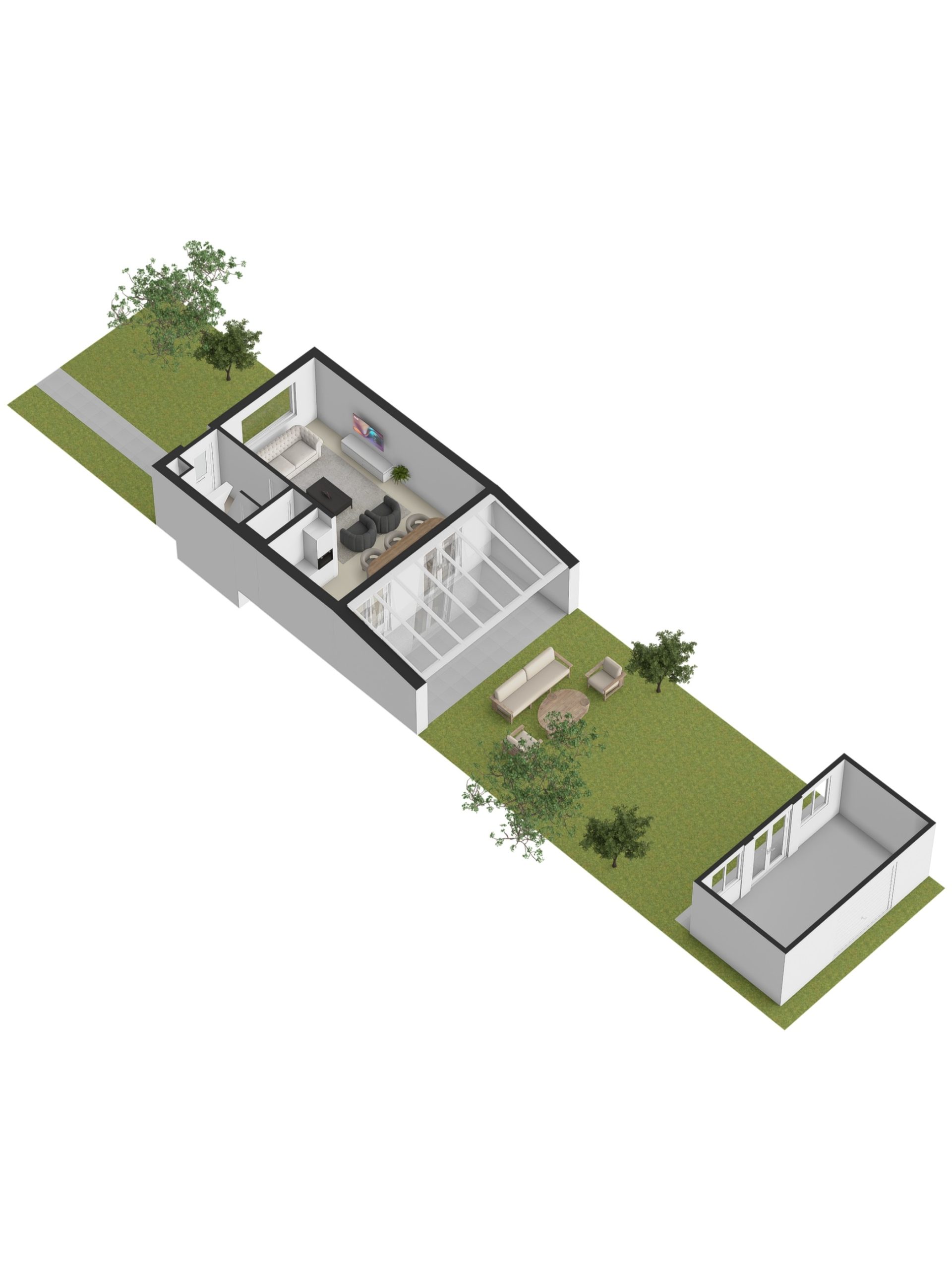 De keuken is modern en open, met greeploze kasten en alle apparatuur die je nodig hebt: kookplaat, afzuigkap, combi-oven/magnetron, koelkast en vaatwasser. Via de openslaande deuren stap je zo de tuin in, waar de overkapping de leefruimte mooi uitbreidt.